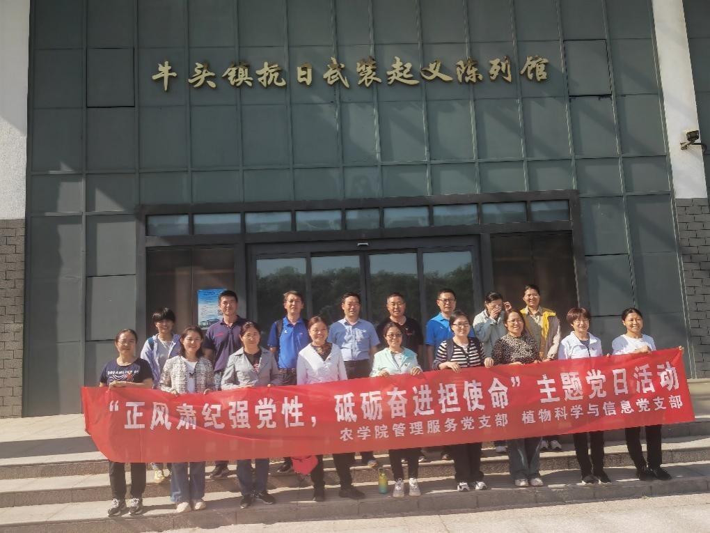 5月12日,农学院管理服务党支部和植物科学与信息党支部赴寿光市联合开展“正风肃纪强党性,砥砺奋进担使命”主题党日活动。 活动中,支部党员走进牛头镇抗日武装起义陈列馆,一副副无声的图片,一件件斑驳的物件,一段段珍贵的视频,让大家切实感受到寿光革命老区的英雄儿女慷慨赴国难、热血浴中华的无畏精神,展示了革命军队在战火中发展壮大的壮丽诗篇。通过实地参观,让教工党员在教书育人、学术科研、管理服务等方面正风肃纪强党性,砥砺奋进担使命,强化廉洁纪律,筑牢师德防线。 随后,支部党员又参观了中国(寿光)国际蔬菜科技博览会馆,菜博会坚持的“蔬菜搭台、经贸唱戏”,搭建起广大涉农企业和农民对接、沟通、交流的优质载体,成为展示新时代“三个模式”、促进国际国内合作交流、助力“双招双引”的特色发展模式,让大家更加体会到,农业插上科技的翅膀,将对实施乡村振兴战略、促进现代农业发展发挥重要的推动作用。 在聆听讲解、观看短片、实地考察后,参加活动党员就如何加强支部建设,助力乡村振兴发展进行了现场研讨交流。大家纷纷表示,促进农业高质高效发展,实现农民富裕富足,助力乡村振兴,重要的途径就是通过科技提升农业发展生产力。作为农学人,要对立足本职,全心全意做好学院师生管理服务保障工作,强化科技创新能力,增强社会贡献度。同时,也要时刻严守纪律规矩、强化廉洁自律,牢记为党育人为国育才的初心使命,满怀奋勇争先、干事创业的斗志,全力服务好学校一流农业大学建设,培养出更多优秀农业人才。