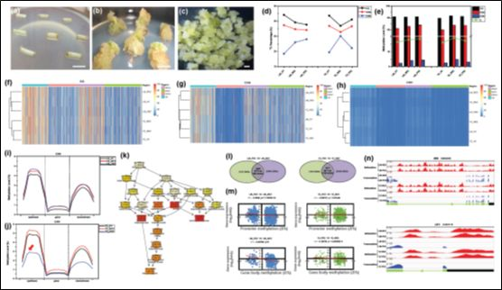 体细胞胚胎发生(Somatic embryogenesis,SE)是体细胞向胚胎发生途径转变的发育再建(Developmental reprogramming)过程,是植物发育过程的独特现象。该过程可在离体条件下人为控制,是最完全的细胞全能性表达的方式和经典示例。作物离体胚性分化与植株再生的调控机理被认为是最重要科学之谜之一。目前,作物离体细胞胚性分化的表观调控规律与分子基础尚不明晰。 同时这一生物过程又是作物细胞与基因工程、无性繁殖与人工种子的重要环节和基础,是现代无性生物育种发展的最直接制约因素和技术瓶颈。在众多作物的组织培养、细胞与基因工程等生物技术应用过程中,胚性分化顽拗型作物种质普通存在,诱导体细胞分化与植株再生的工作仍是经验式的,存在相当大的盲目性,还无法从根本上有目的地、高效精准地调节和控制体细胞胚性分化与植株再生过程,这在很大程度上限制了细胞与基因工程在现代无性育种上的应用。 山东农业大学作物生物学国家重点实验室曾范昌教授团队,基于棉花体细胞不同胚性分化能力的代表种质,比较分析了种内和种间在离体细胞脱分化及胚性再分化过程中的基因组DNA甲基化的表观调控模式与区域位点。解析了不同代表种质离体细胞分化发育各个重要转变时期的DNA甲基化修饰特征和调控规律,不同类型的DNA甲基化(CG, CHG与CHH)在不同种质胚性分化过程中存在着显著不同的甲基化修饰特异性(基因型特异性、发育时期特异性), 揭示出高效离体胚性分化的特异甲基化位点类型与调控模式。进一步,挖掘出胚性分化起始相关的甲基化基因及其参与的重要生物过程和代谢通路。同时, 鉴定了不同胚性分化能力种质受甲基化修饰的特异表达基因及其负调控互作模式。