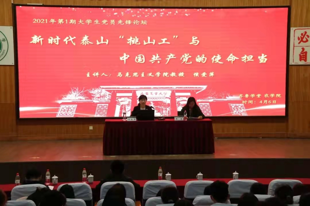 4月6日下午,农学院、齐鲁学堂在南校区举办2021年第一期大学生党员先锋论坛。论坛特邀马克思主义学院侯爱萍教授以《新时代泰山“挑山工”与中国共产党的使命担当》为题,为齐鲁学堂、农学院全体学生党员、入党积极分子作报告。