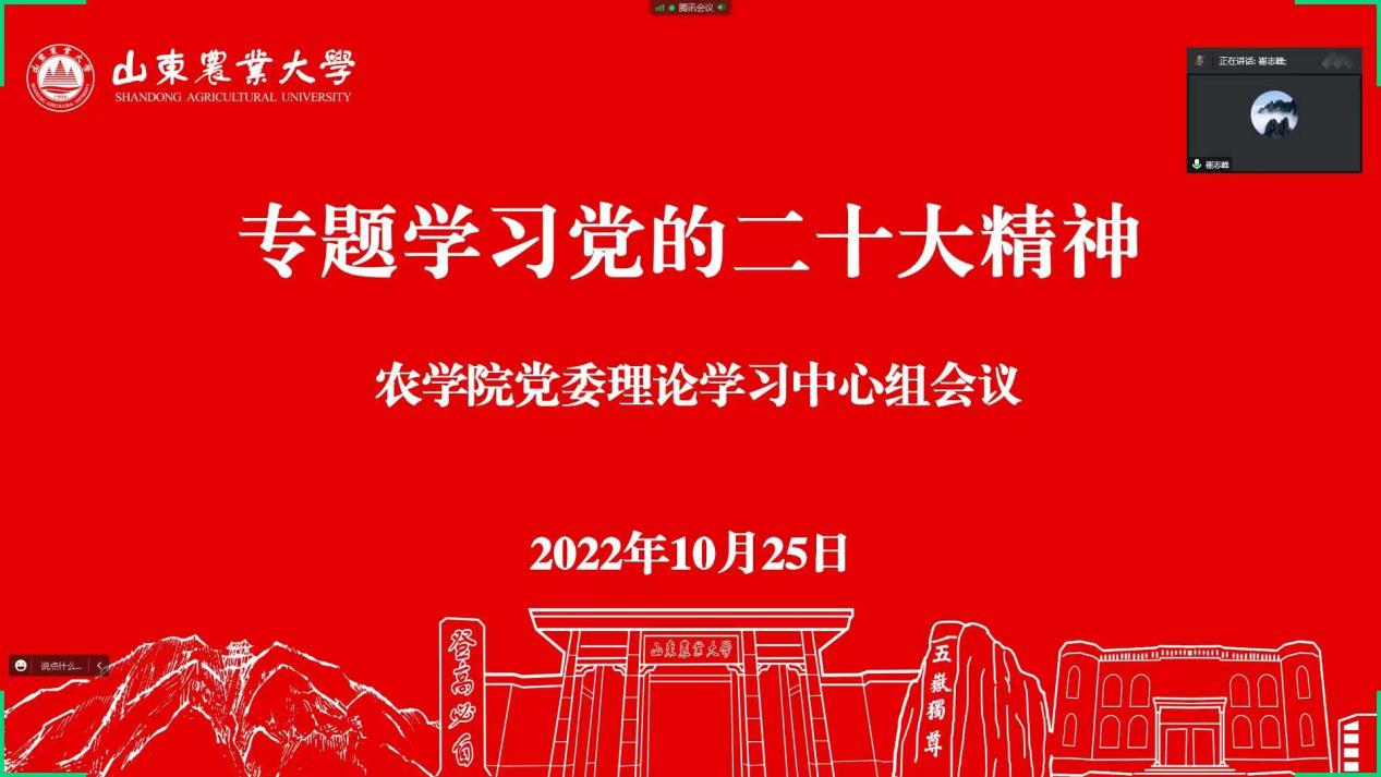 农学院党委理论学习中心组(扩大)会议专题学习党的二十大精神 10月25日,农学院党委召开党委理论学习中心组(扩大)会议,专题学习习近平总书记在中国共产党第二十次全国代表大会上所作的报告,深入贯彻党的二十大精神。党委书记崔志峰主持会议并领学,学院领导班子成员、各支部书记参会。 会议认为,党的二十大是在全党全国各族人民迈上全面建设社会主义现代化国家新征程、向第二个百年奋斗目标进军的关键时刻召开的一次十分重要的大会。党的二十大报告高举中国特色社会主义伟大旗帜,全面贯彻习近平新时代中国特色社会主义思想,深入分析国内外形势,提出党的二十大主题。报告高屋建瓴、内涵丰富、振奋人心,是谱写新时代中国特色社会主义新篇章的政治宣言和行动纲领。党的二十届一中全会选举产生了新一届中央领导机构,习近平总书记再次当选中央委员会总书记,充分体现了习近平总书记掌舵领航新时代新征程,赢得全党全军全国各族人民的衷心崇敬和拥戴。 崔志峰对学院学习贯彻党的二十大精神提出明确要求,一是提高政治站位,强化思想认识。学习贯彻党的二十大精神是当前和今后一个时期全院的首要政治任务。学院党委、各支部要带头提高政治站位,发挥战斗堡垒作用,充分认识学习宣传贯彻党的二十大精神的重大意义,带领全院师生原原本本学、认认真真学、带着问题学、结合实际学,着力掌握精神实质,在学懂弄通上下功夫、在融汇贯通上见真章。二是创新方式方法,激发学习动力。各系室、各支部要充分利用各种新媒体手段,采用座谈会、交流会、“三会一课”、主题党团日等多样形式,认真学、反复学,不断激发广大师生的学习热情,引导全院师生听党话、跟党走,切实把思想和行动统一到报告精神上来。三是立足工作实际,坚持学用结合。全院师生要深刻领会和贯彻落实党的二十大精神的精髓要义,积极对接国家重大战略需求,充分发挥学科优势,聚焦农业科技“卡脖子”难题,坚持把服务乡村振兴、推进农业农村现代化作为农学人的初心使命,加快推动高质量科技创新成果转化落地,不断提升服务地方经济发展的能力,为打造乡村振兴齐鲁样板提供强有力的智力和科技支撑。 下一步,学院党委将紧紧围绕党的二十大报告中提到的“实施科教兴国战略,强化现代化建设人才支撑”加压奋进、主动担当,切实把党的二十大精神贯彻落实到新农科人才培养、种质创新、社会服务等实际工作中,在争创国家一流学科上当先锋、打头阵,在实现学校高质量内涵式发展的新赛道上展现农学担当。