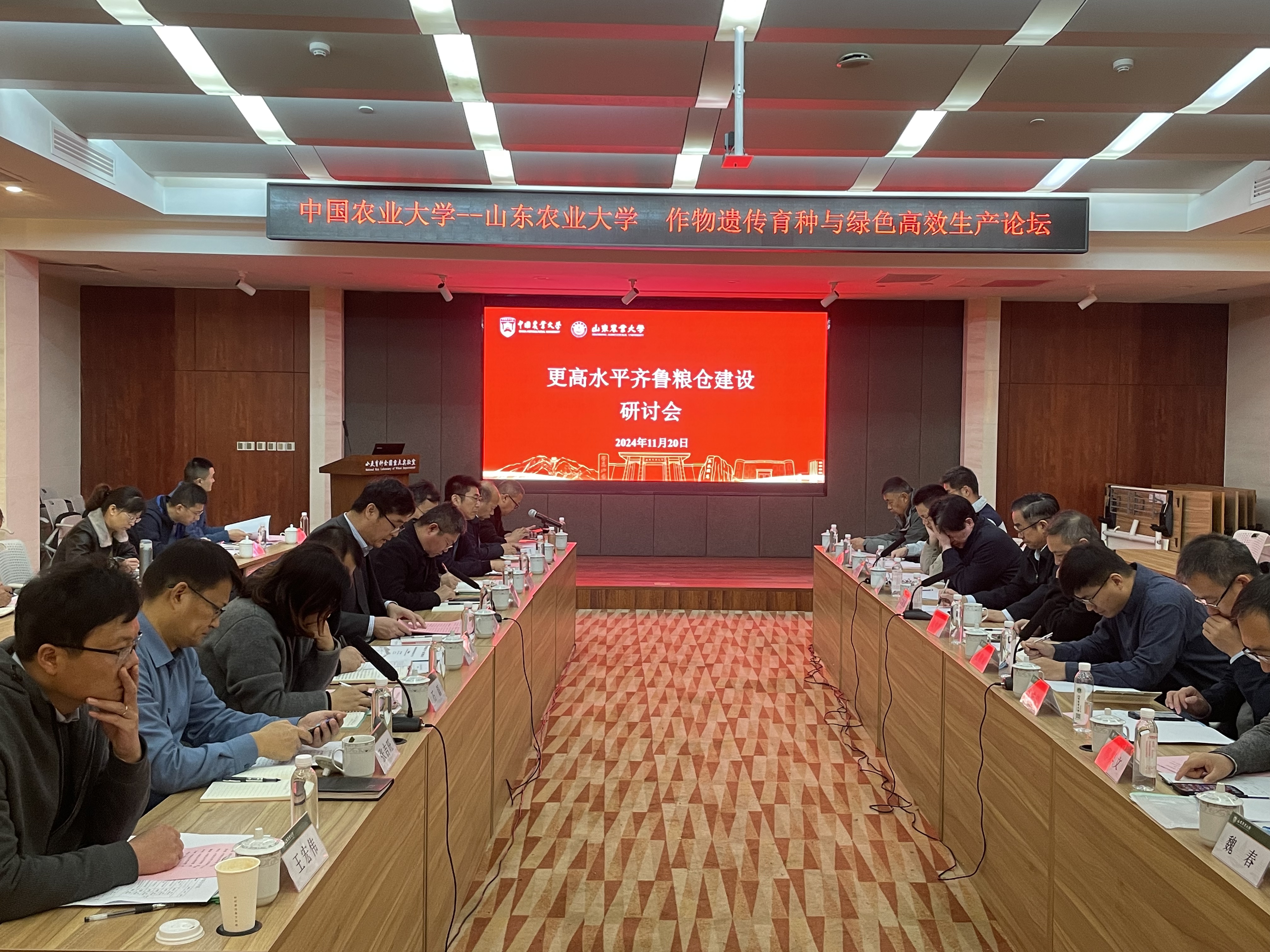 11月20日,中国农业大学与山东农业大学-作物遗传育种与绿色高效生产论坛在登高楼一楼报告厅举行。上午,学校党委常委、副校长王勇,“齐鲁粮仓”发展战略研究中心主任、中国农业大学国家农业科技战略研究院院长高旺盛教授,中国农业大学农学院倪中福院长,及学校科技处、发规处、人事处和站园中心等相关人员出席会议,围绕更高水平齐鲁粮仓建设、学科建设和人才培养进行研讨交流。