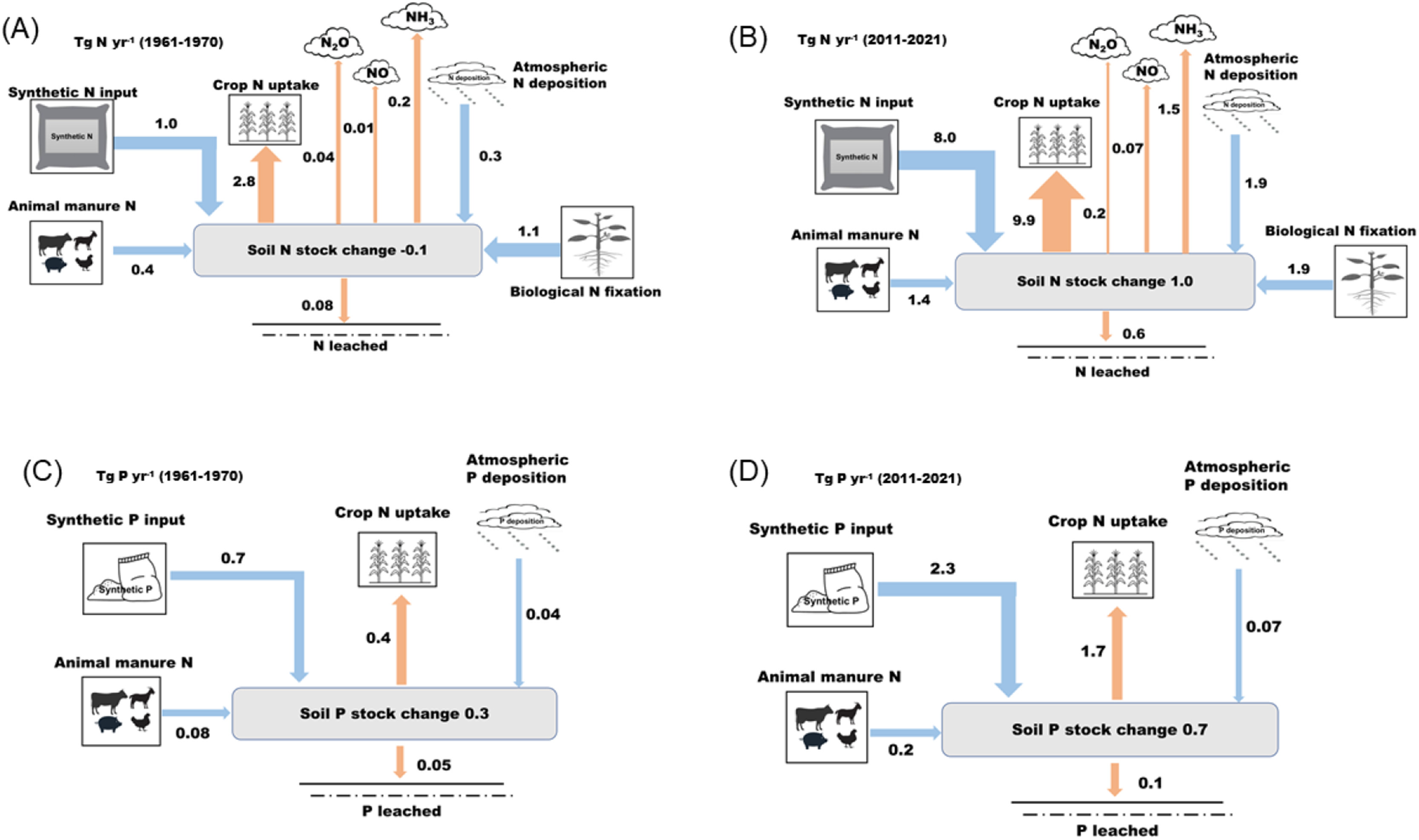 本研究系统分析了1961-2021年非洲各国家的氮磷养分流动动态及其驱动因素。结果表明,非洲农田氮输入量由17.9 kg ha-1增至46.9 kg ha-1,磷输入量由4.8 kg ha-1增至9.5 kg ha-1,但仍远低于全球平均水平。氮利用效率从91.3%下降至74.6%,而磷利用效率从57.8%上升至64.3%,可见非洲氮磷养分管理的不平衡性。目前北非农产品卡路里和蛋白质日供应量已达日推荐量,但撒哈拉以南国家仍低于该值。人均GDP、能量供应与氮磷利用效率呈显著负相关,但依区域而异,未来需制定区域差异化的氮磷养分管理策略。